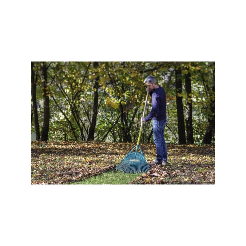 Permet de balayer sur de grandes surfaces extérieures. Tête polymère, légère, robuste. 27 dents plates, rigides et galbées. Manche bois PEFC. Longueur du manche : 130 cm Largeur de l'éventail : 65 cm Poids : 1,160 kg