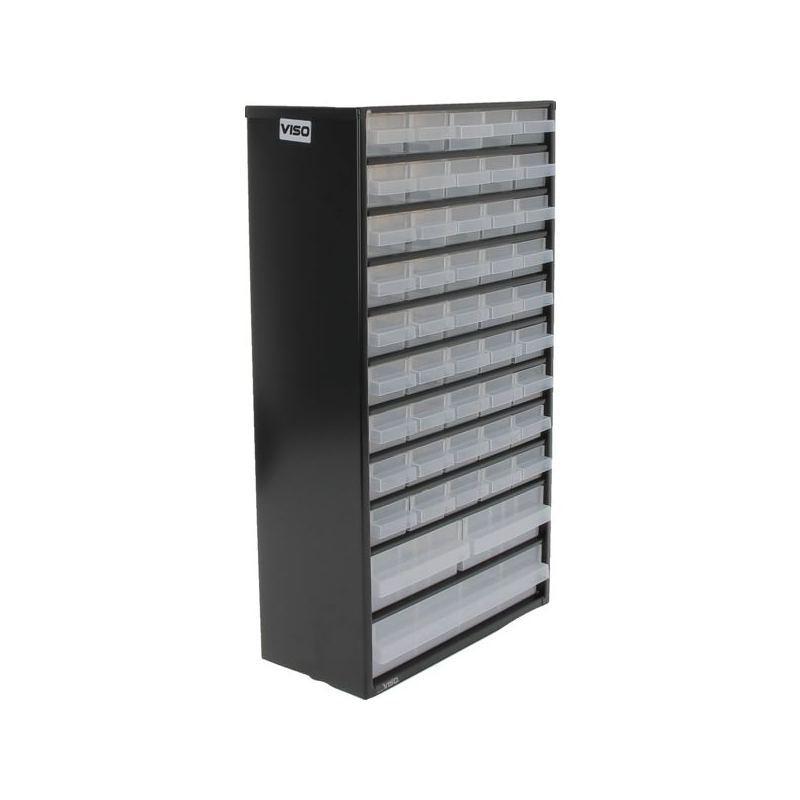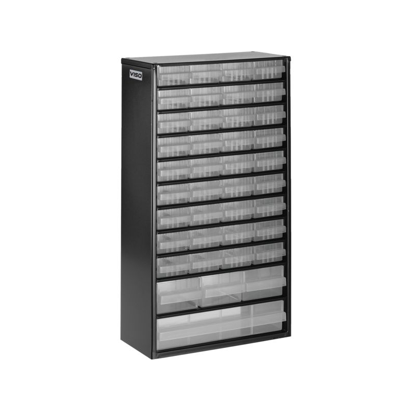 En métal laqué noir, tiroirs incassables en polypropylène transparent avec poignée, porte-étiquettes, étiquettes et séparateurs. À suspendre ou à poser. Livré avec fixations murales.