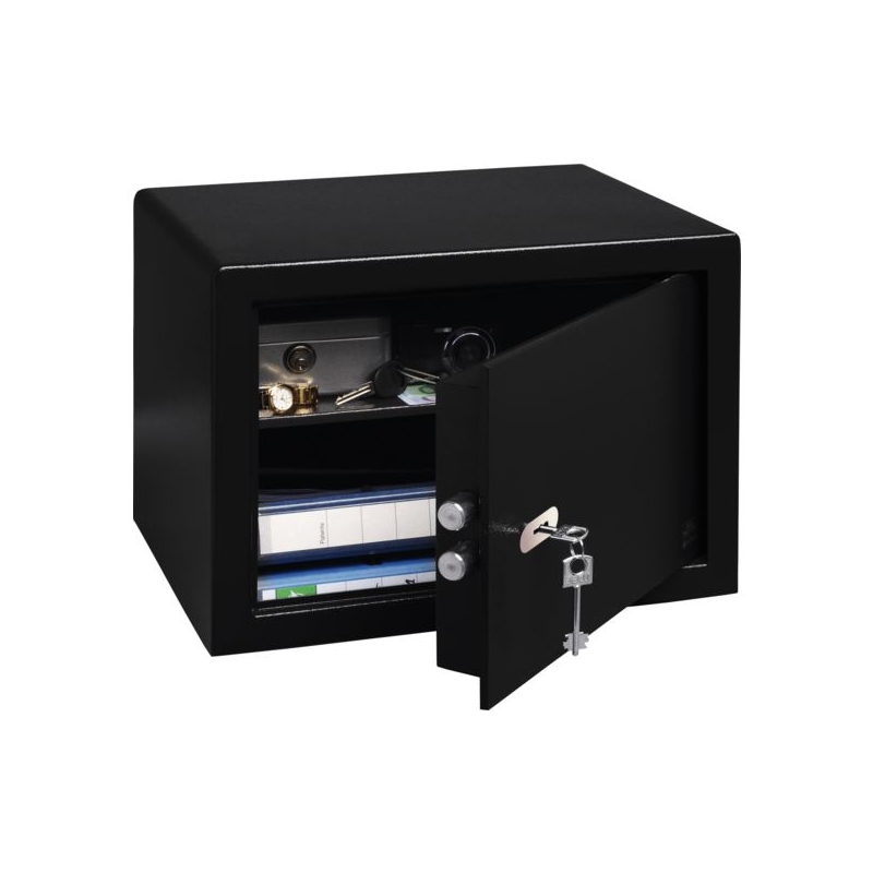 Corps solide à une paroi avec étagère amovible. Porte à double paroi. Conçu pour être fixé au mur ou au sol, livré avec matériel de fixation. Utilisation confortable grâce au verrouillage/déverrouillage automatique par pênes motorisés. Avec code administrateur et code utilisateur. Alimentation par 4 piles LR 06 incluses. Serrure additionnelle avec clé de secours. Dimensions extérieures (HxLxP) : 320 x 442 x 350 mm Dimensions intérieures (HxLxP) : 310 x 435 x 288 mm Ouverture de la porte (HxL) : 188 x 230 mm Poids : 20 kg Volume : 38.8 l