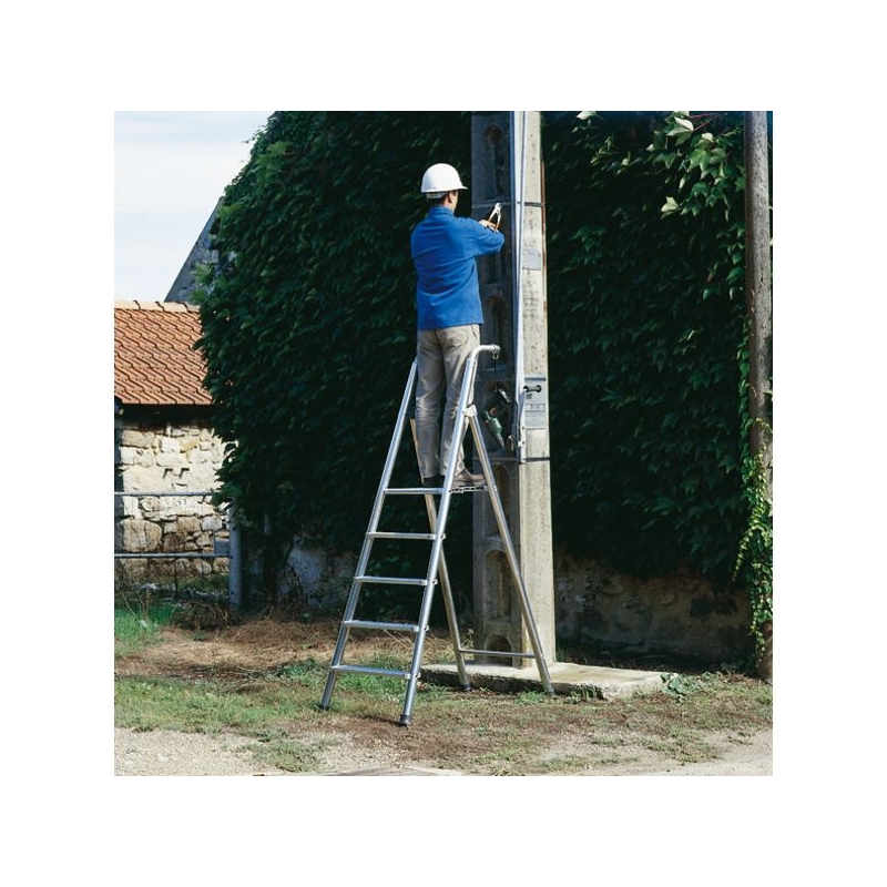 Spécialement étudié pour un emploi dans des conditions extrêmes. Usage ultra-intensif BTP. En aluminium. Marches striées antidérapantes de 100 mm. Plateforme de 390 x 382 mm. Montant en tube rond Ø 50 mm. Liaison montant/marche anti-rotation, repose-pieds repliable en alu extrudé. Sabots enveloppants antidérapants. Porte-outils avec porte-seau intégré. Charge maxi. : 150 kg Norme : EN 131 - décret 96 333