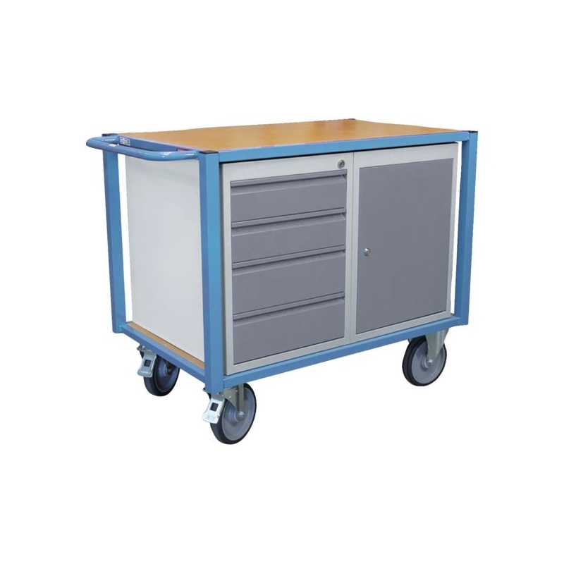 Arceau de poussée, plateau en médium de 16 mm d'épaisseur. Roues à bandage TPE Ø 200 mm, 2 fixes + 2 pivotantes à frein. Verrouillage des portes et des tiroirs à fermeture centralisée avec 1 jeu de 2 clés fourni. Capacité de charge : 500 kg Dim. plateaux bois : 1060 x 680 mm Dim. blocs : 470 x 625 x 620 mm Dim. hors-tout : 1185 x 680 x 930 mm Équipements : - 1 bloc porte équipé d'une étagère, - 1 bloc tiroirs (2 tiroirs hauteur 100 mm et 2 tiroirs hauteur 150 mm) Livrée montée.