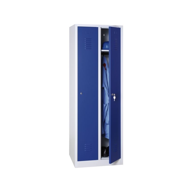 Ouverture des portes à 115°. Fermeture par loqueteau cadenassable. Aération haute et basse. Porte-étiquette. Compartiment chapeau/casque. 1 tringle et 3 crochets pour les modèles industrie propre , 2 tringles + 5 crochets pour les modèles industrie salissante . Perçages pour fixation au mur. Épaisseur de tôle corps et portes : 0,6 mm Hauteur : 1800 mm Profondeur : 500 mm Sans pied.
