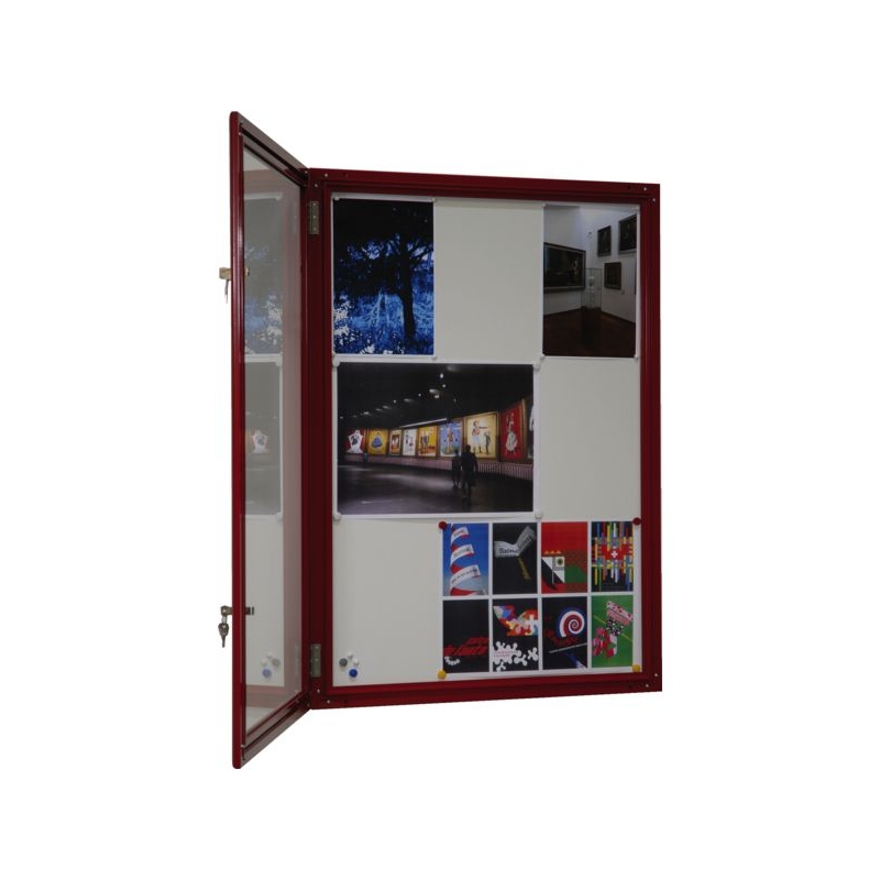 Vitrine réversible avec fond tôle laquée électrozinguée (affichage magnétique). Porte battante démontable avec charnière inox. Encadrement aluminium anodisé, façade verre Sécurit 4 mm. Fermeture par serrure dans le vitrage. Fixation murale 4 points. Épaisseur hors-tout : 35 mm Épaisseur utile : 21 mm Existe en noir, gris et rouge.